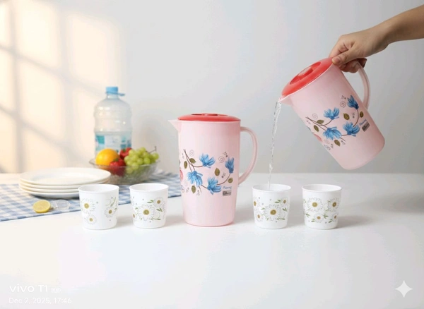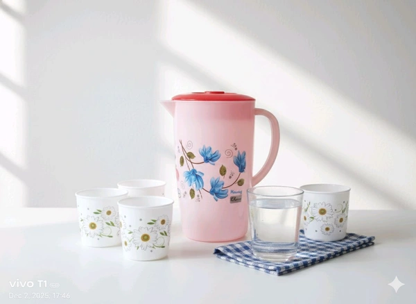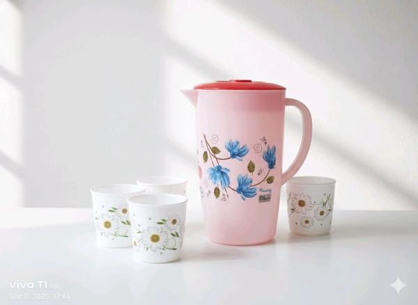 Upgrade your dining experience with the KOYAL JUG WITH 4 GLASS, exclusively available at 99 WHOLLSELLE. Whether you're serving water, juice, or your favorite beverages, this elegant jug and glass set is designed to impress and serve with ease. Perfect for family meals, gatherings, or everyday use, this set adds a touch of sophistication to your table.